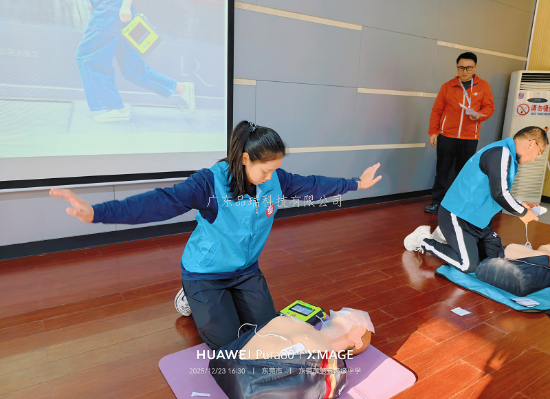 2025年12月23日,东莞市第五高级中学邀请广东品瑞科技参与学校应急救护培训与交流。品瑞科技派出专业辅导老师全程授课,此次培训涵盖“急救生命链流程、止血包扎、海姆立克急救法、心肺复苏(CPR)及AED除颤仪使用”等核心技能。