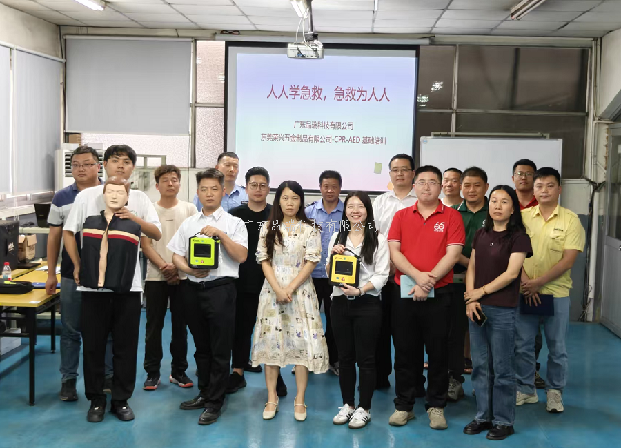 此次与品瑞科技的合作,聚焦 “精准配置 + 专业培训” 核心需求。品瑞急救团队深入荣兴企业车间、食堂、办公楼等人员密集区域,结合五金行业生产特点与场所布局,科学规划AED设备点位,确保设备 “易找、易用、易维护”同时,定制化开展急救技能培训,覆盖AED操作、心肺复苏、应急处置等核心内容,帮助企业员工快速掌握救命技能,实现 “设备到位、技能到位、责任到位”。